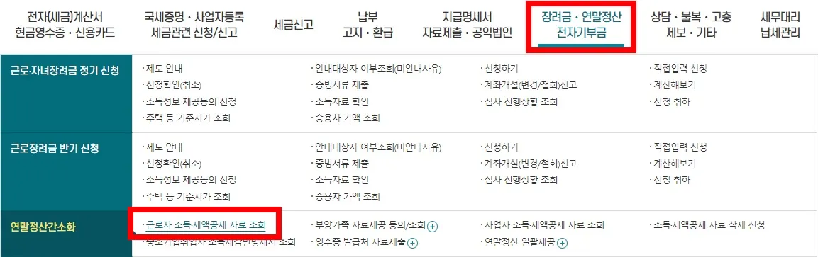 1. ์๋ ๋ฒํผ์ ํด๋ฆญํด ํํ์ค ๋ก๊ทธ์ธ > '์ฅ๋ ค๊ธ·์ฐ๋ง์ ์ฐ ์ ์๊ธฐ๋ถ๊ธ'์ ์ฐ๋ง์ ์ฐ๊ฐ์ํ '๊ทผ๋ก์ ์๋์ธ์ก๊ณต์ ์๋ฃ ์กฐํ' ํด๋ฆญ